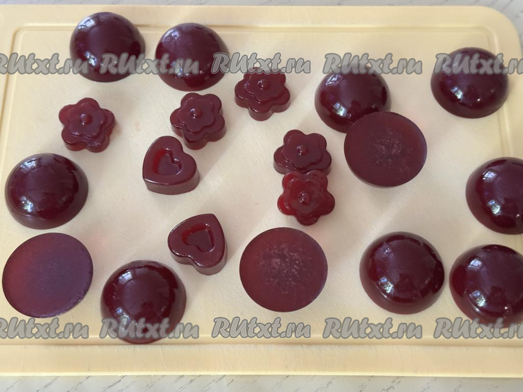 Я использовала небольшие силиконовые формы для формирования конфет. Можно взять привычные силиконовые формы для выпечки маффинов и заполнять их на 1/4 объёма. А можно вылить массу в одну силиконовую форму, а после застывания разрезать мармелад на части.