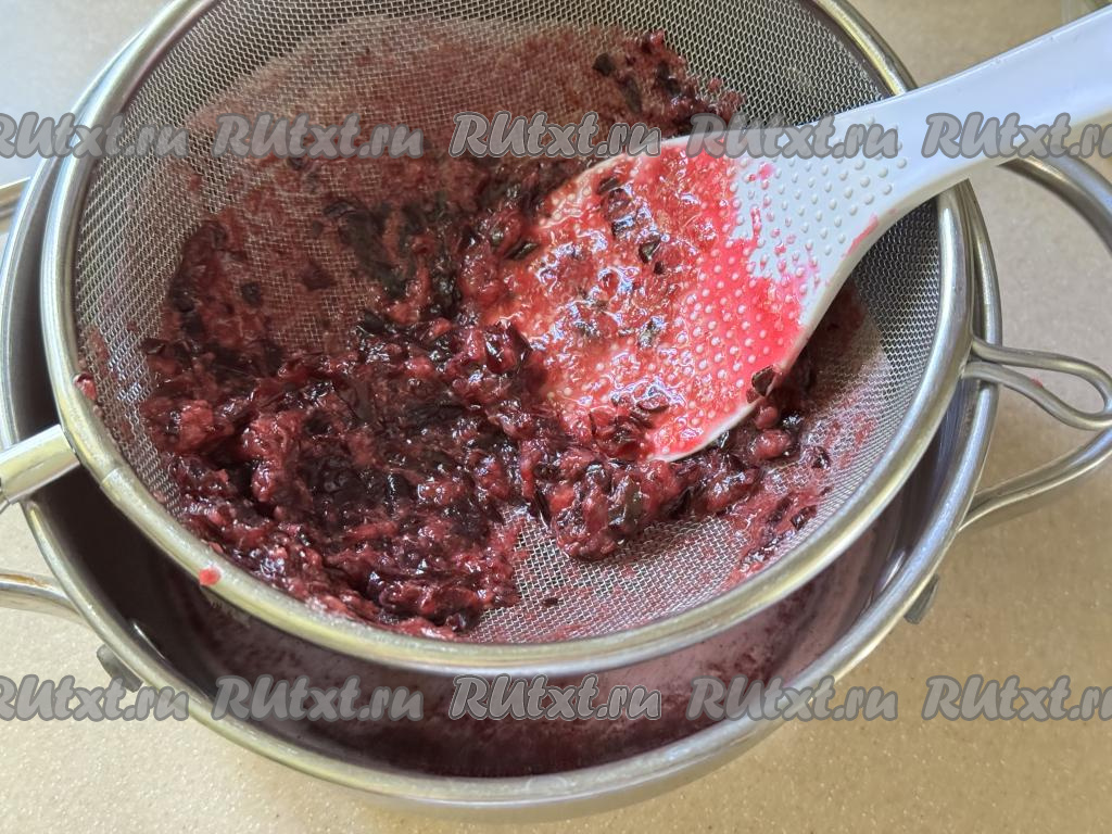 Затем взять небольшую кастрюлю с толстым дном, поверх неё поставить сито. Выложить в сито ягодную массу и перетереть с помощью лопатки (или столовой ложки) в кастрюлю. В результате перетирания ягодной массы в сите останется совсем немного жмыха, который нам не понадобится.