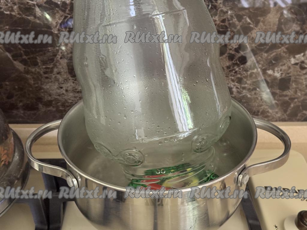 Банки (я взяла 2 банки объёмом по 2 литра) вымыть, простерилизовать удобным для вас способом (я простерилизовала банки над паром). Крышки прокипятить в течение 3 минут с момента закипания воды в кастрюле.
