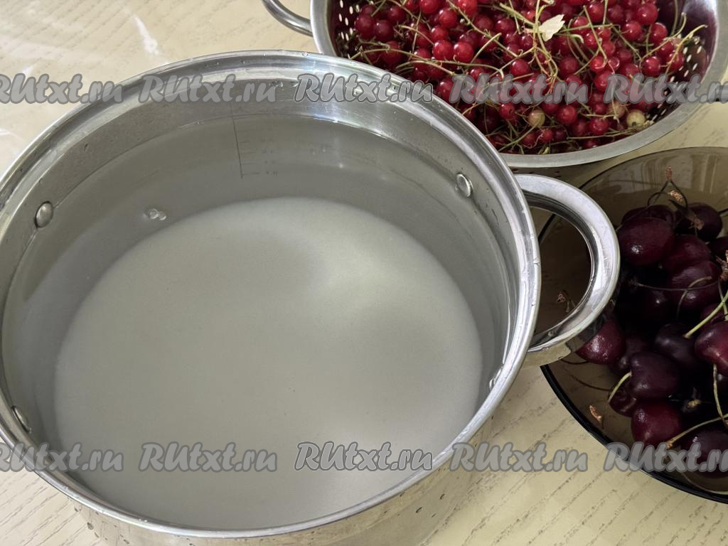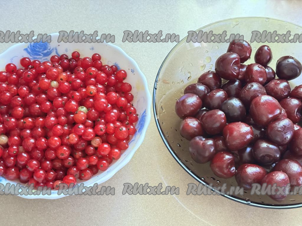 Пока вода с сахаром закипает, займёмся ягодами и банками. Красную смородину нужно перебрать, отделяя веточки и убирая листья, промыть ягоды проточной водой. Хорошо вымыть черешню, убирая веточки, вынимать косточки из ягод не нужно.