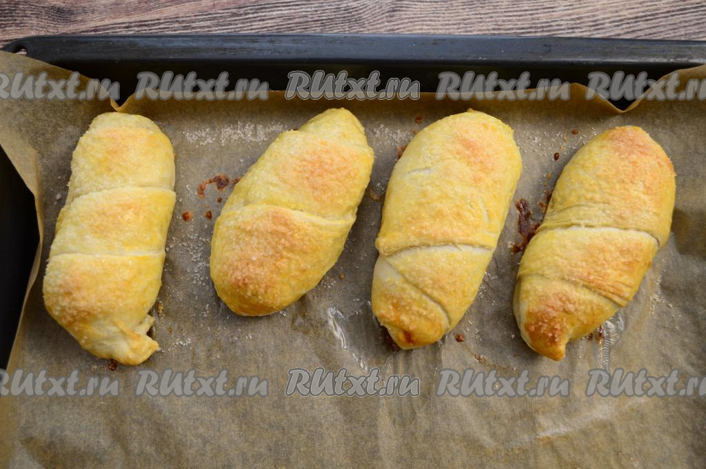 Выпекать булочки с бананом в разогретой до 200 градусов духовке в течение 20-25 минут (до подрумянивания слоёного теста).