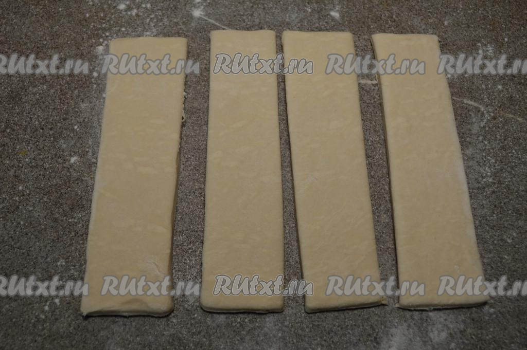 Пласт слоёного теста, не раскатывая, на слегка присыпанной мукой поверхности разрезать на 4 одинаковых полоски.