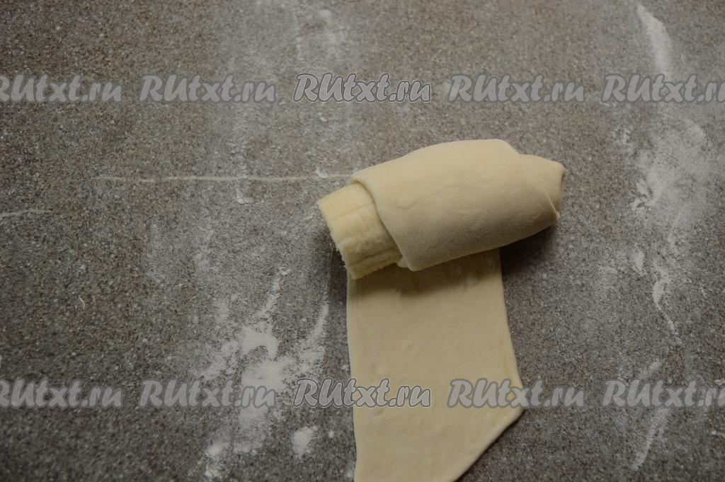 Очистить банан, разрезать на 2 примерно равные части. Начиная с узкого края банана, начать заворачивать банан в раскатанную полоску теста, как на фото.