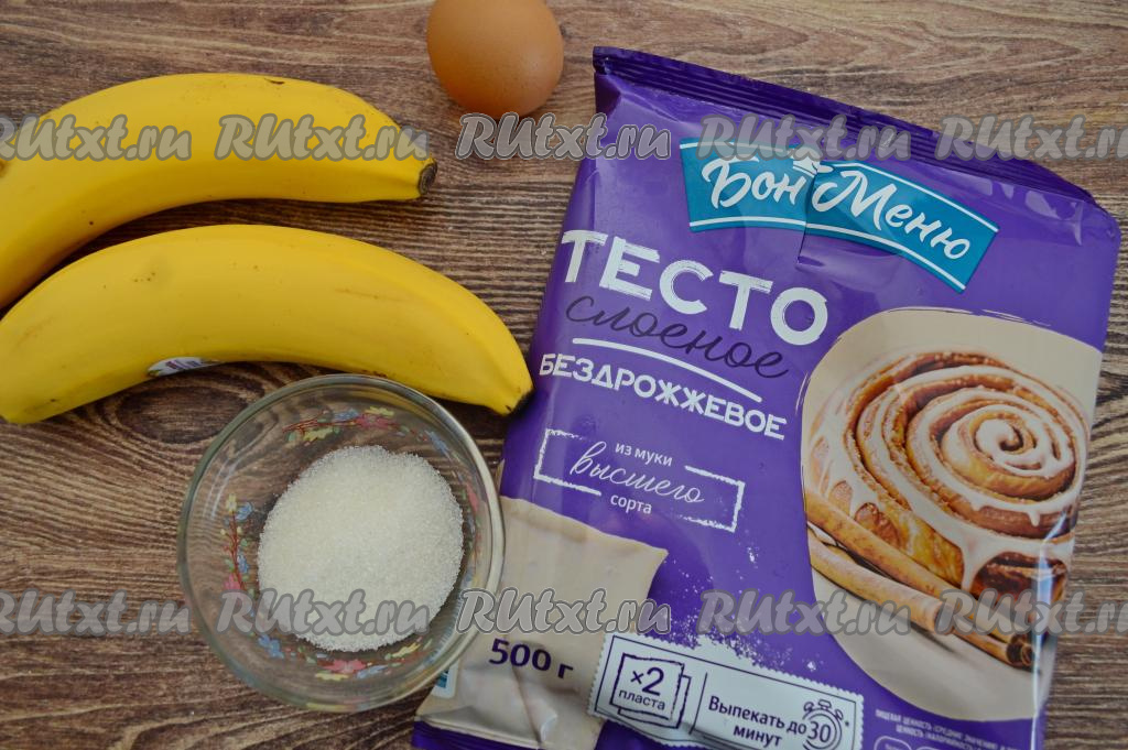 Подготовить продукты. Слоёное тесто нужно заранее разморозить при комнатной температуре. Слоёное тесто для этой выпечки можно взять как дрожжевое, так и бездрожжевое. Бананы лучше выбирать спелые, сладкие, можно даже слегка переспелые.