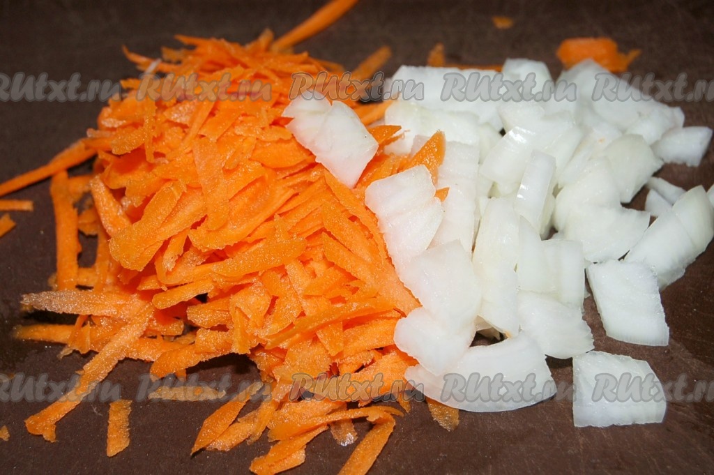 Морковь натереть на крупной терке, репчатый лук нарезать небольшими кусочками.