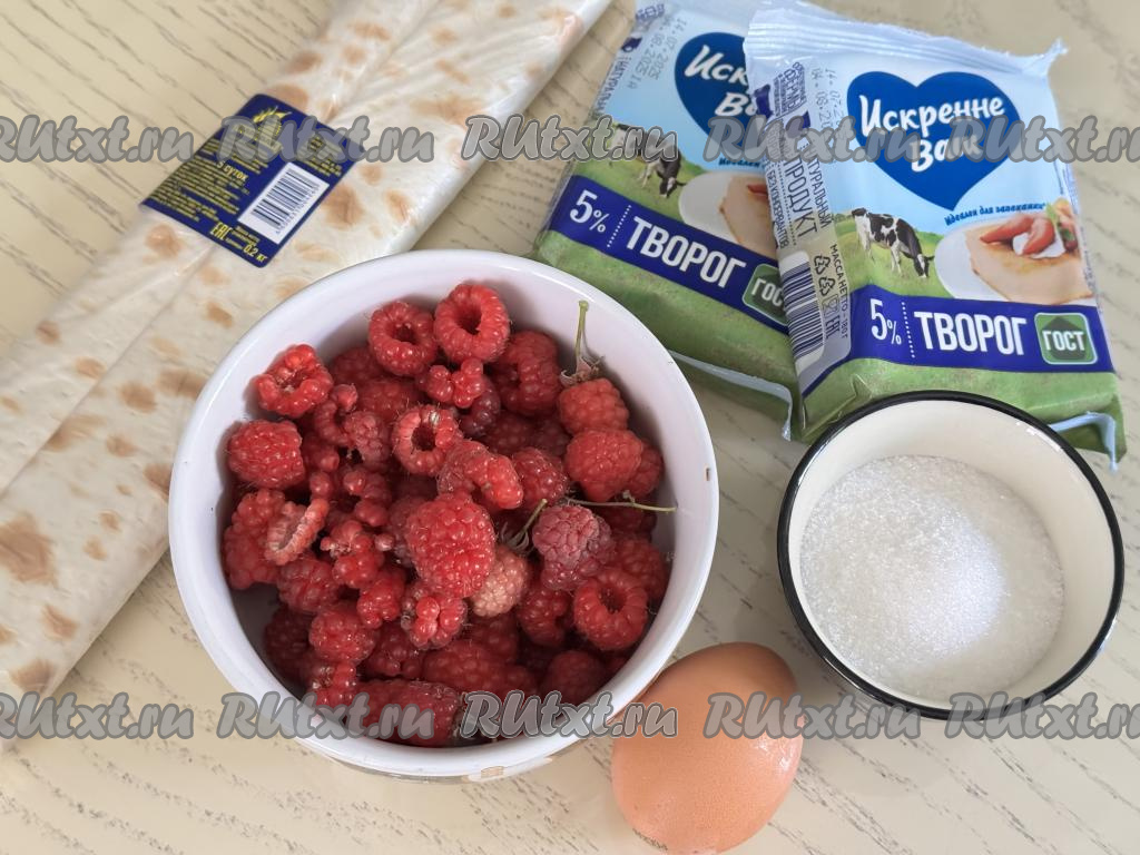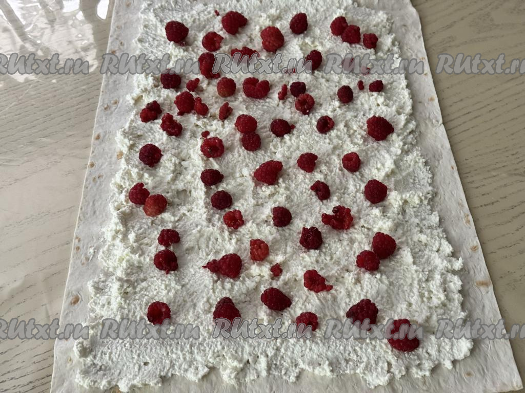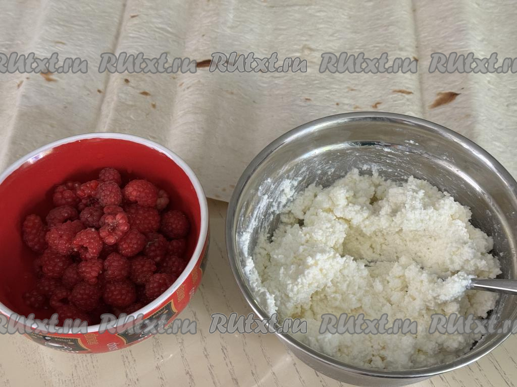 Подготовить продукты. Творог можно купить любой жирности (я использовала жирностью 5%) и консистенции. Малину можно использовать как свежую, так и замороженную. Свежую малину нужно перебрать, убирая плодоножки, затем аккуратно промыть ягоды водой, разложить их на бумажном полотенце, чтобы они обсохли. Если же вы будете готовить рулет из лаваша с замороженной малиной, на которой нет большого количества наледи, значит ягоды можно не размораживать.