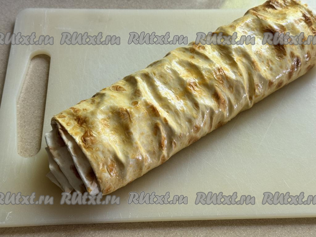 Немного подвернуть вначале боковые края лаваша на начинку, а затем, начиная с более узкого края, свернуть лаваш с творожно-ягодной начинкой в рулет.