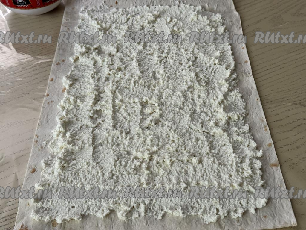 Отступая от краёв лаваша по 2 сантиметра, смазать равномерно лаваш творожной начинкой.