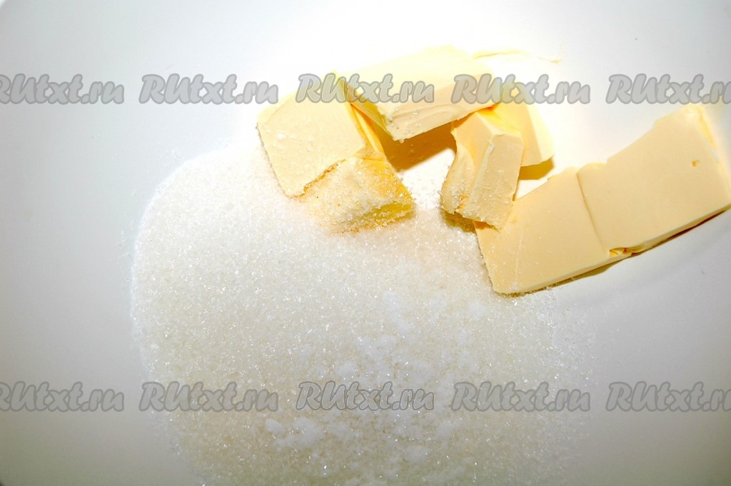 Положить в миску масло сливочное комнатной температуры, сахар, ваниль и взбить миксером.