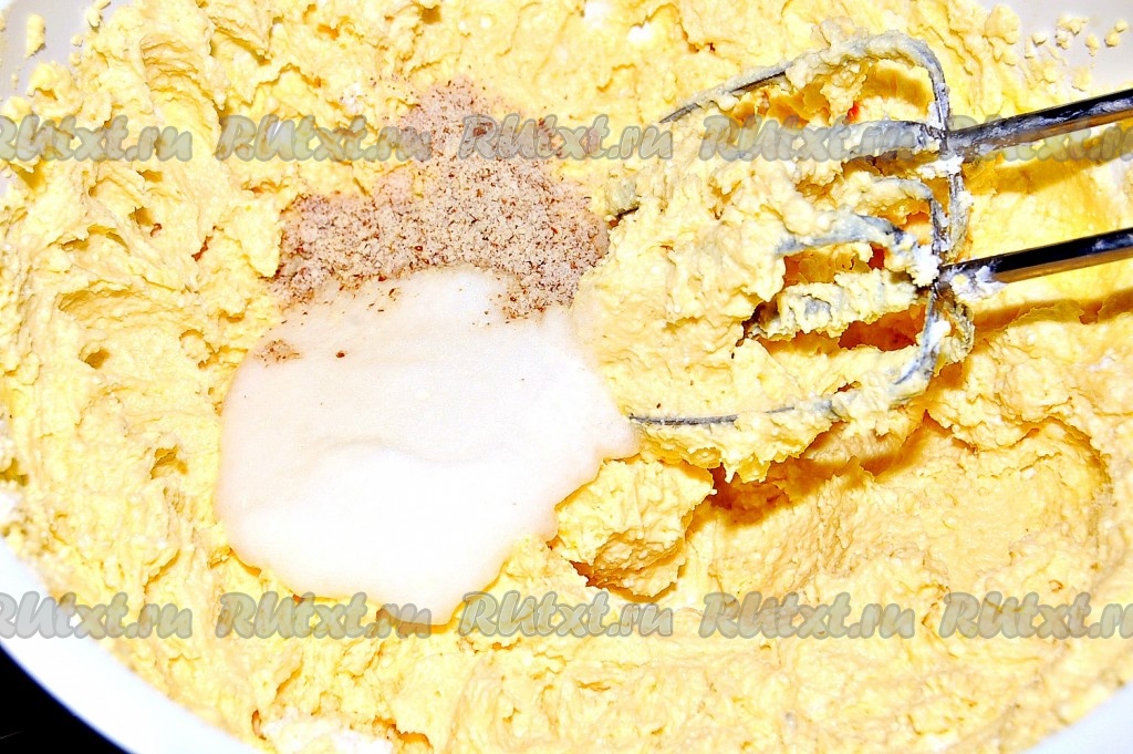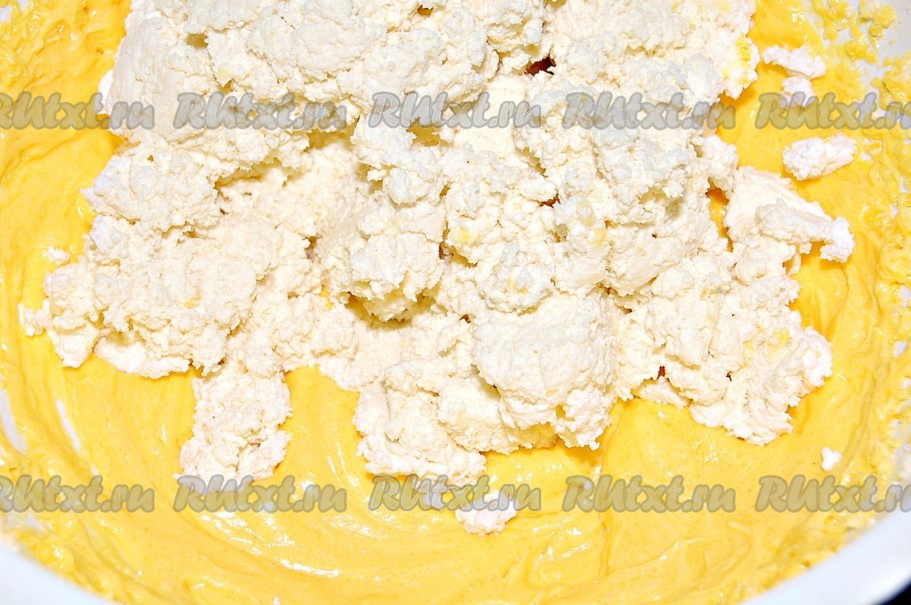 Миндальную муку и взбитые белки небольшими порциями добавить к творожной массе, каждый раз аккуратно перемешивая тесто.