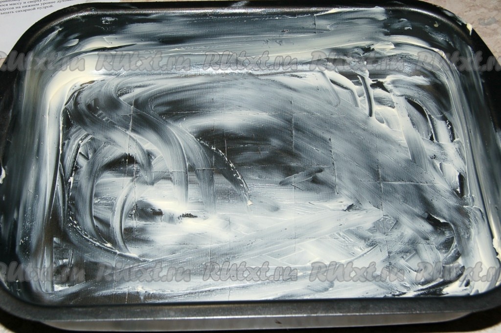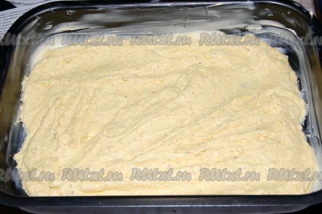 Выложить в форму чуть больше половины творожно-миндального теста для запеканки.