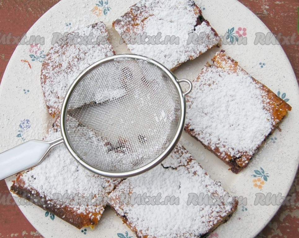 Даём вкусной, ароматной творожной запеканке, приготовленной с добавлением миндальной муки, немного остыть, разрезаем на кусочки, посыпаем сахарной пудрой и идём пить чай.