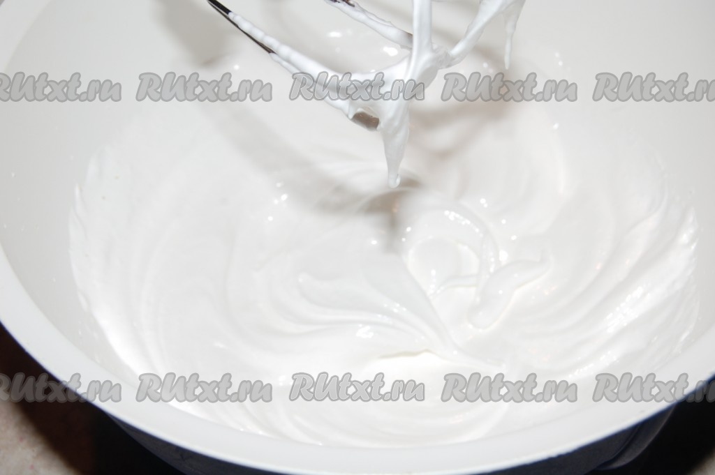 В сухой посуде с помощью миксера взбить охлаждённые белки с щепоткой соли до плотной пены.