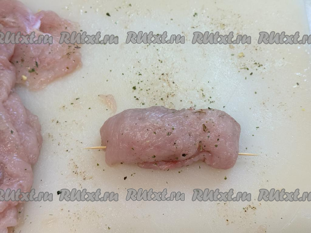 Для того чтобы рулетик хорошо держал форму и не разворачивался, можно края филе скрепить зубочисткой. Аналогично сформировать все рулетики из куриного филе с сырной начинкой.