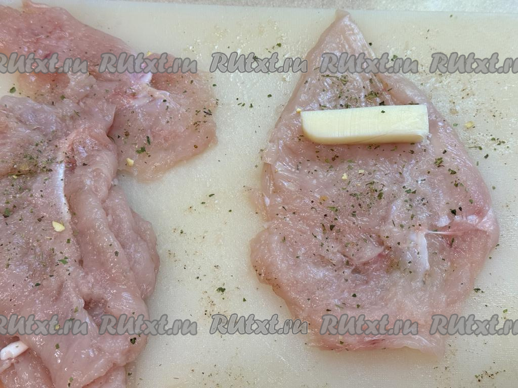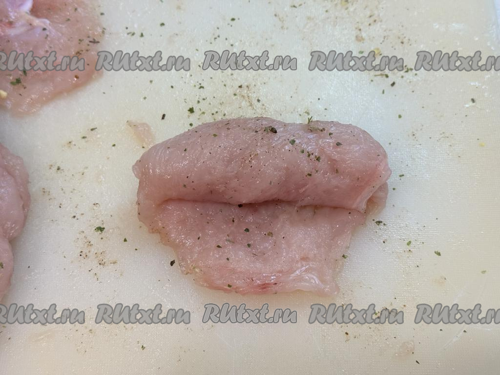 Начиная со стороны с сыром, свернуть каждую куриную отбивную в рулетик, закрывая сыр внутри.