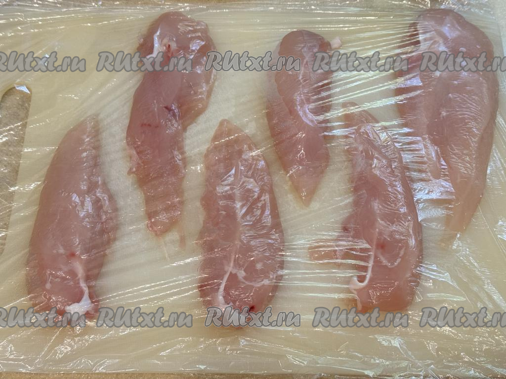 Куриное филе нарезать на полоски толщиной 1-1,5 сантиметра. У меня получились 6 полосок. Выложить нарезанное филе на разделочную доску, прикрыть пищевой плёнкой (или целлофановым пакетом).