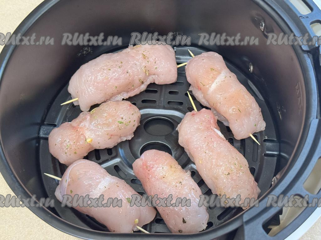 Запекать рулетики из куриного филе с сыром в аэрогриле 25 минут при температуре 180 градусов.