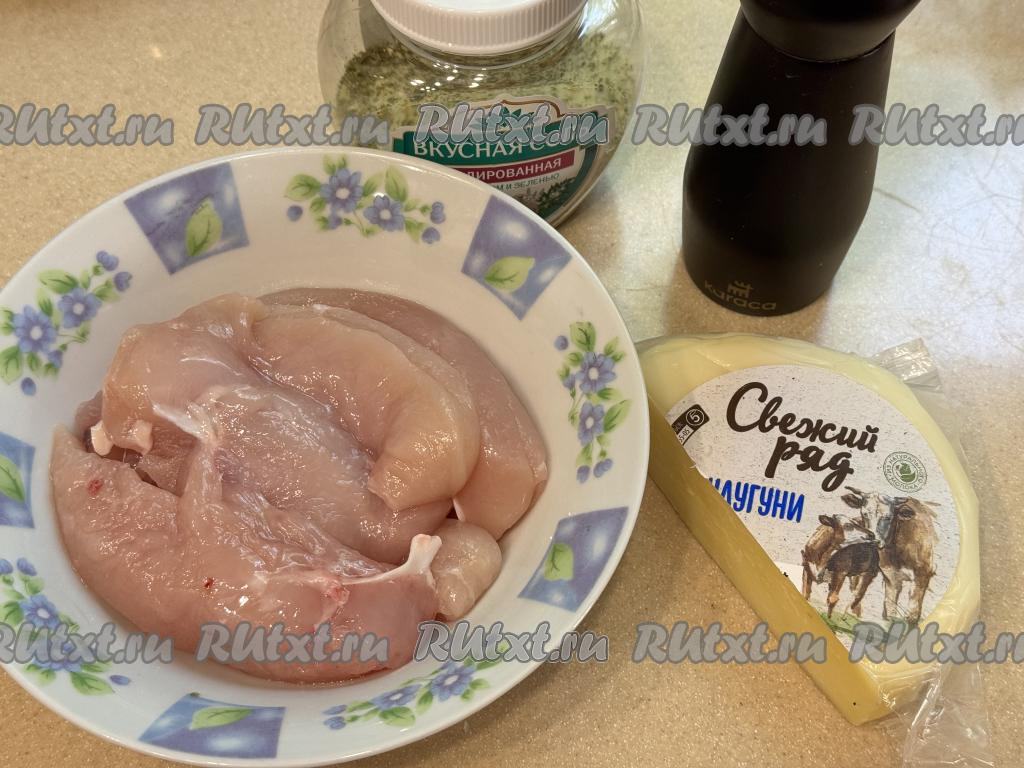 Подготовить продукты. Сыр можно использовать любой твёрдый или полутвёрдый (я использовала сулугуни). Куриное филе промыть водой, обсушить.