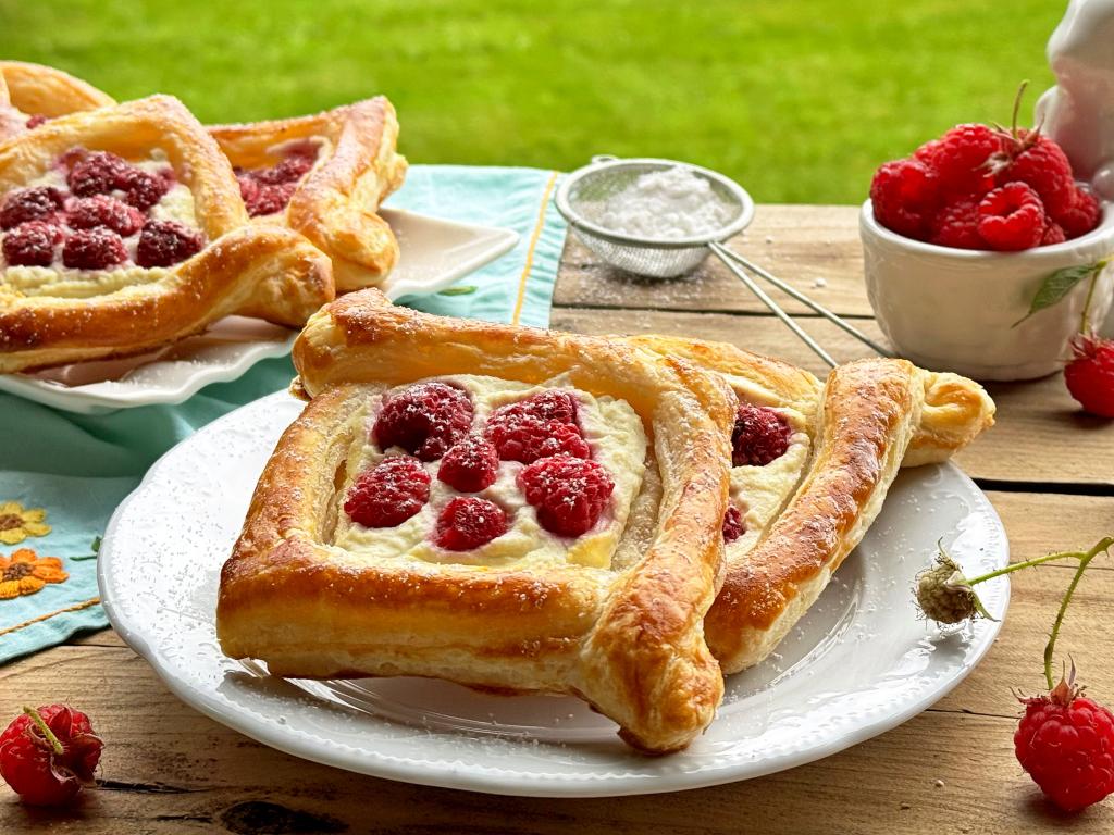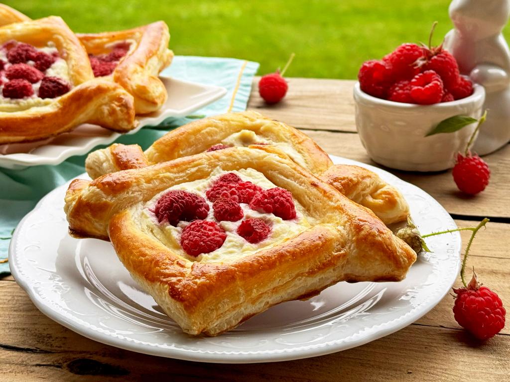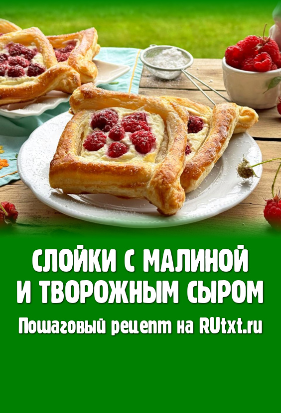 Нежные, вкусные, воздушные слойки с начинкой из малины и творожного сыра можно есть как тёплыми, так и остывшими. При желании перед подачей их можно посыпать сахарной пудрой.