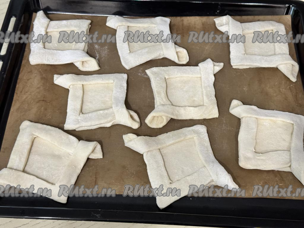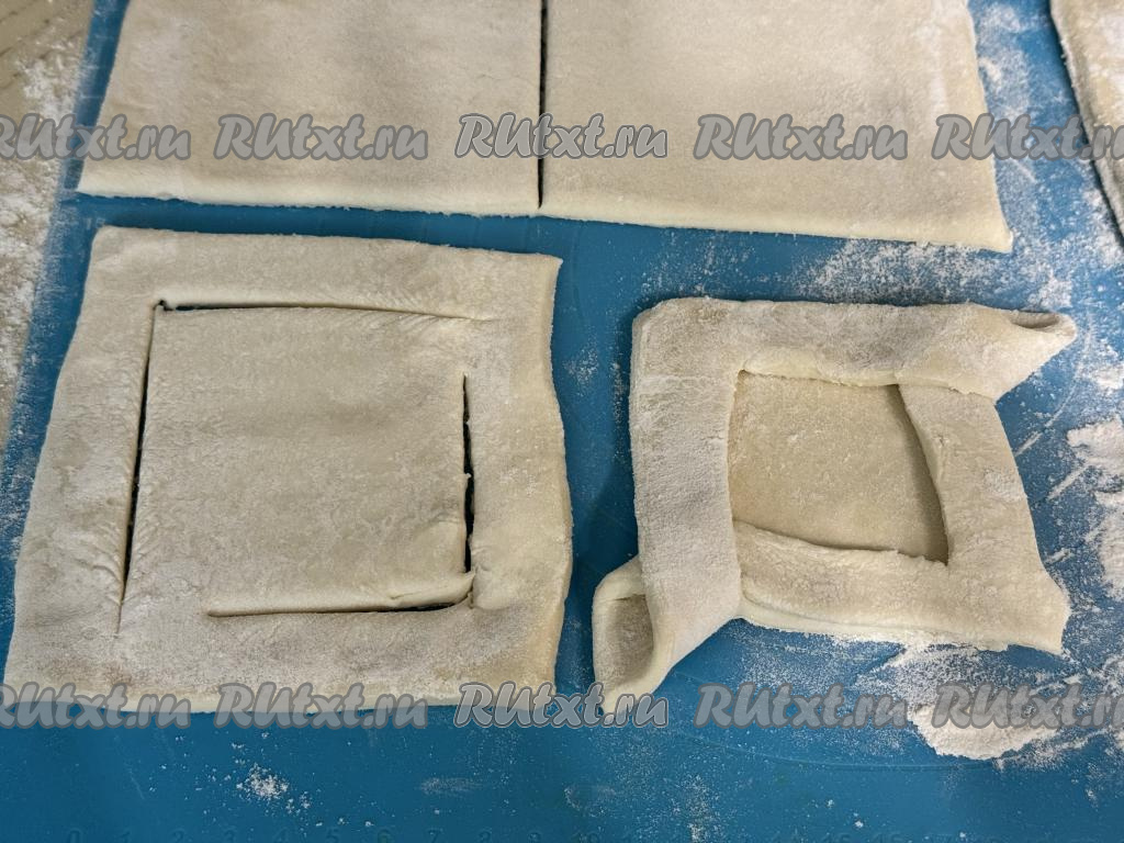 Теперь из квадратных заготовок нужно сформировать открытые слойки. Для этого, отступив от краёв теста примерно по 1 сантиметру, нужно в противоположных углах квадрата сделать надрезы так, чтобы они не пересекались (то есть разрезы не доходили до оставшихся углов квадрата), как на фото. Перекинуть получившиеся полоски теста на противоположные стороны. У нас получится слойка с аккуратными и красивыми бортиками.