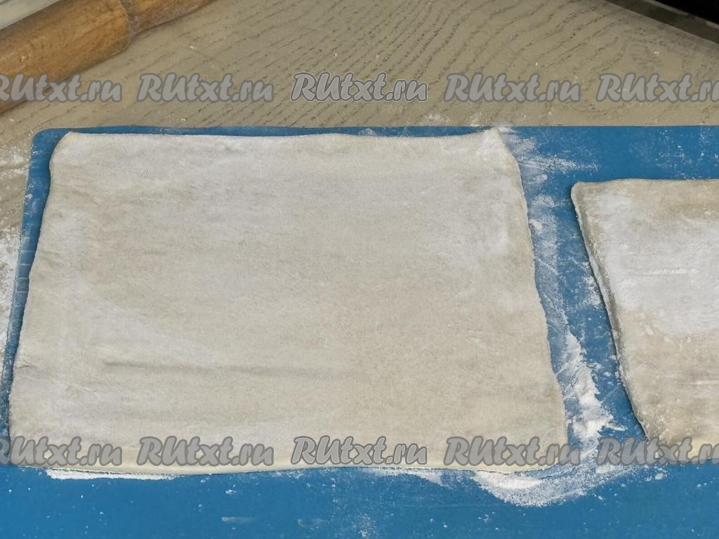 Слоёное тесто у меня было в двух пластах. Вначале первый пласт теста выложить на припылённую мукой поверхность, раскатать скалкой до толщины примерно 3 миллиметра.