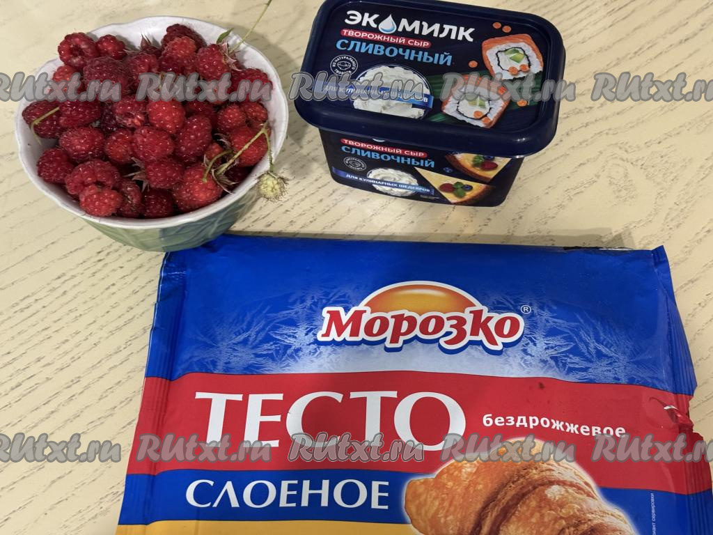 Подготовить продукты. Творожный сыр нужен без добавок (нейтрального вкуса). Слоёное тесто можно взять как бездрожжевое (именно его я и купила), так и дрожжевое. Тесто заранее разморозить при комнатной температуре. Малину можно использовать как свежую, так и замороженную. Свежие ягоды нужно перебрать, удаляя плодоножки, если они есть, затем промыть ягоды водой и обсушить, разложив на бумажном полотенце. Замороженную малину можно не размораживать, если на ней немного наледи.
