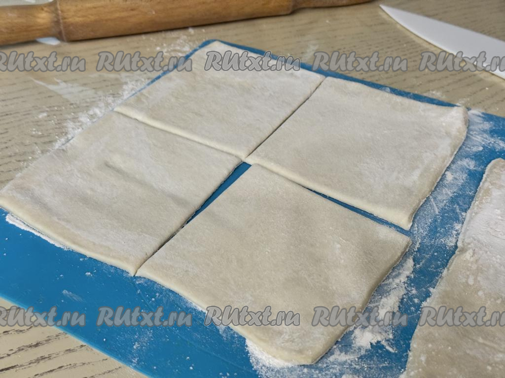 Разрезать раскатанный пласт на 4 квадрата. Аналогично раскатать второй пласт теста и тоже разрезать на 4 квадрата.