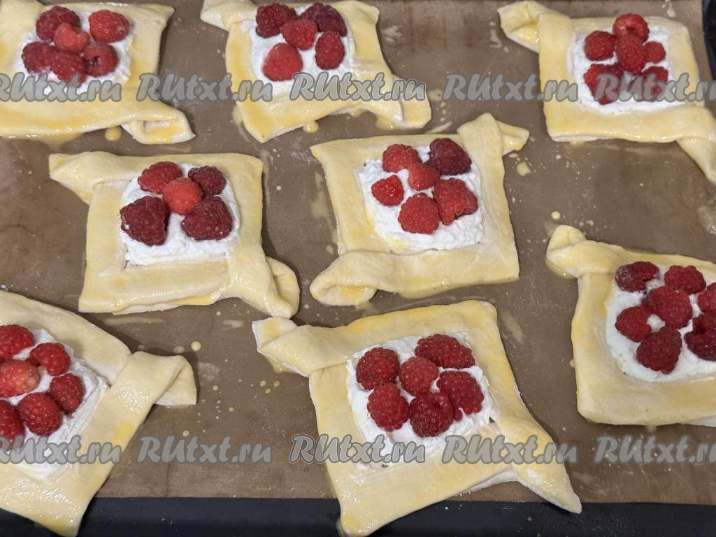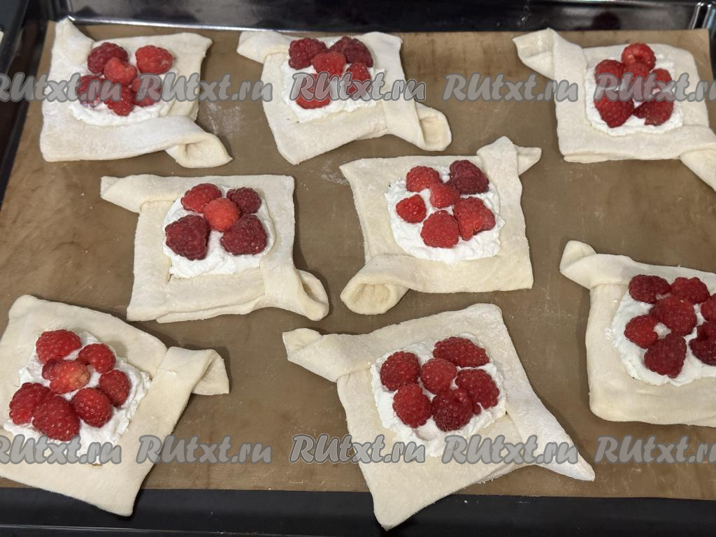 Поставить противень в разогретую до 200 градусов духовку. Выпекать слойки с творожным сыром и малиной минут 20 (до приятного золотистого оттенка слоёного теста).