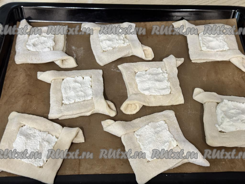 Творожный сыр может быть разной степени солёности, поэтому, добавляя сахар, можете ориентироваться на свой вкус. В общей сложности я добавила 8 чайных ложек сахара и слойки получились в меру сладкими.