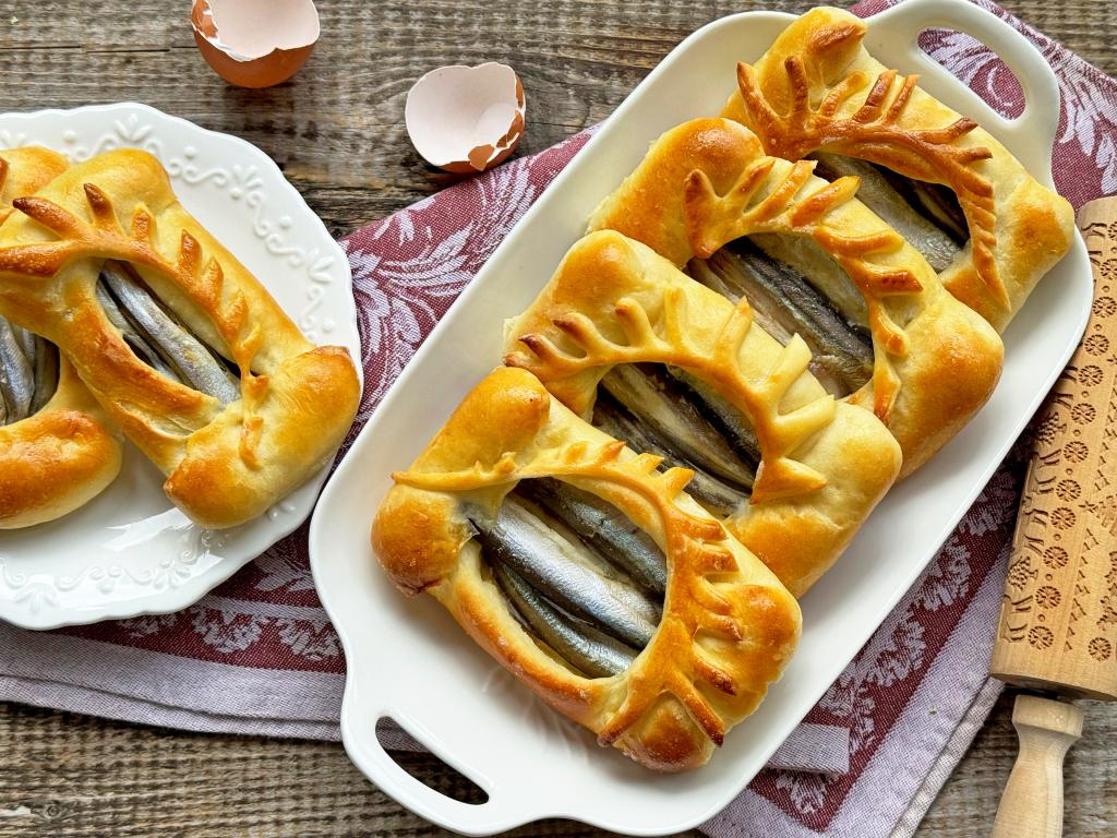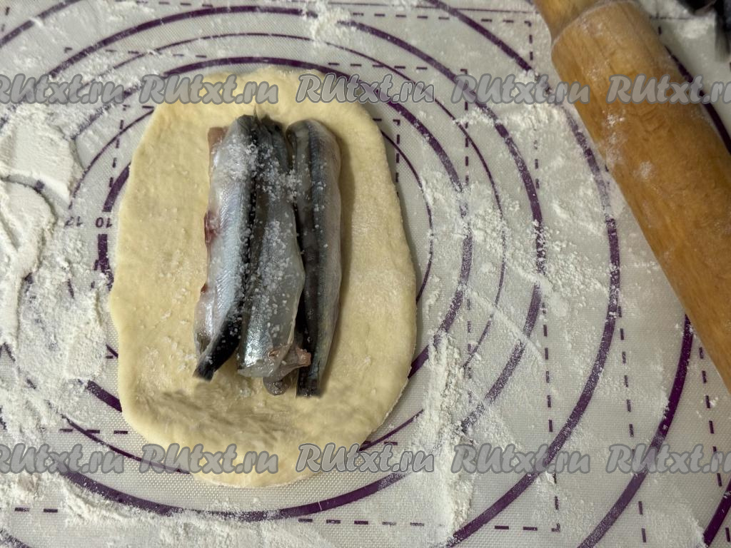 Разделить тесто на 10 частей. У нас получатся 9 пирожков с мойвой и одну часть теста будем использовать для формирования украшения. Каждую часть теста слегка раскатать скалкой в овал, выложить в середину 3-4 рыбки.