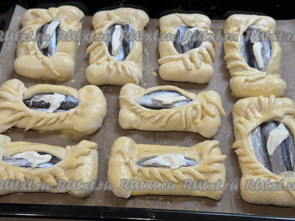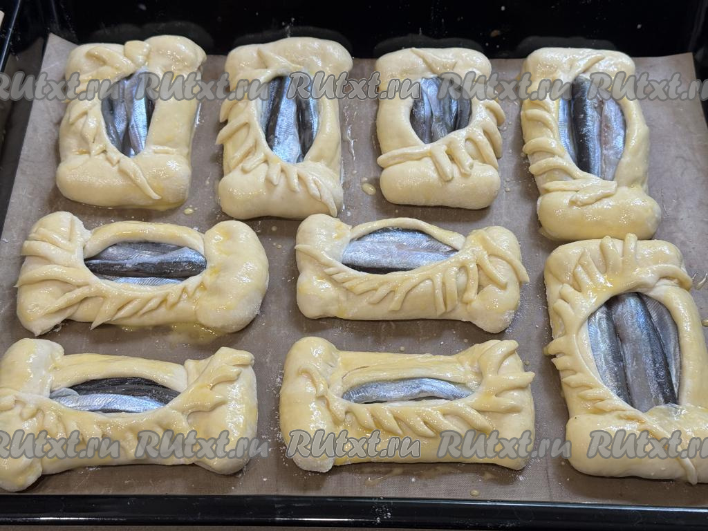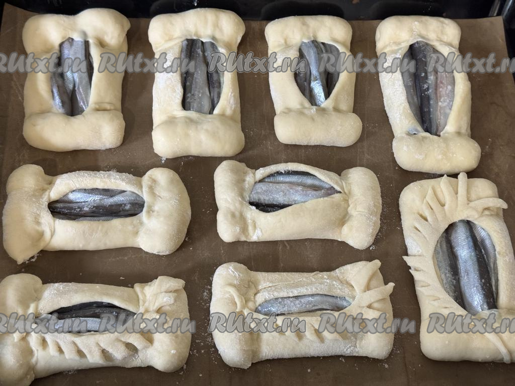 А затем немного подвернуть более короткие края овала на рыбку, прижимая края теста пальцами. Сформированный открытый пирожок с мойвой выложить на противень, застеленный пергаментом (или ковриком) для выпечки. Аналогично сформировать ещё 8 пирожков с рыбкой, выкладывая их на застеленный противень на небольшом расстоянии друг от друга.
