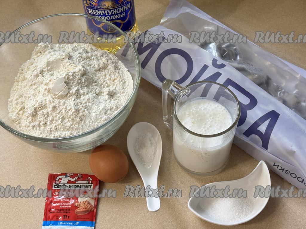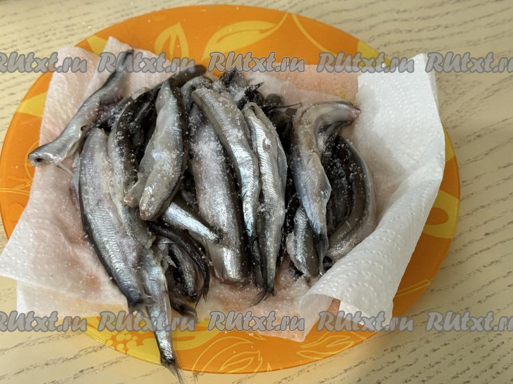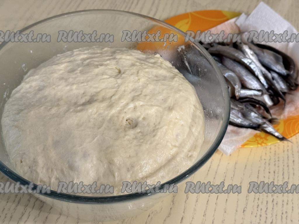 Миску с тестом, накрыв пищевой плёнкой (или полотенцем), оставить в тёплом месте на 1 час (до увеличения теста в объёме в 2-3 раза). Пока дрожжевое тесто подходит, можно заняться рыбой. Мойву нужно очистить от головы и внутренностей, удалить хребет и плавники. Хорошо промыть рыбу и обсушить, выложив на бумажные полотенца. Посолить мойву по вкусу.