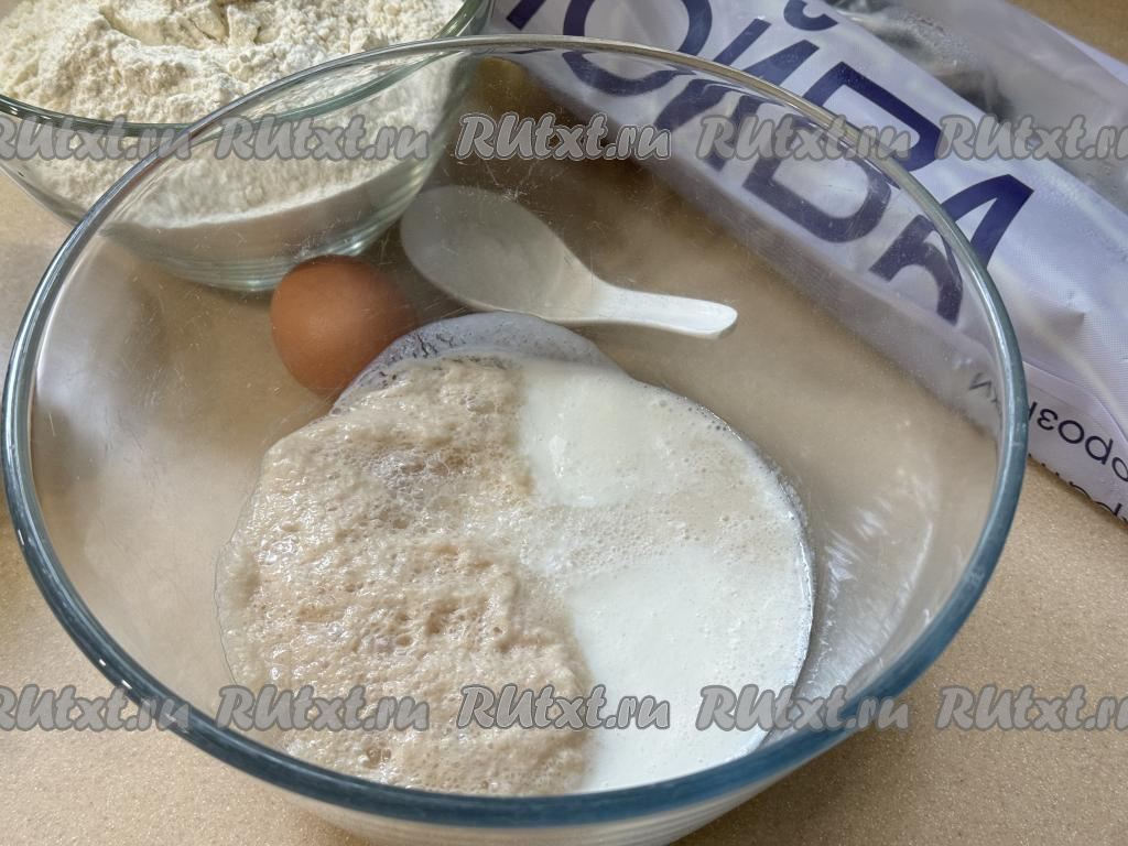 В глубокую миску, в которой вы будете замешивать тесто, влить запенившуюся дрожжевую смесь и кефир комнатной температуры.