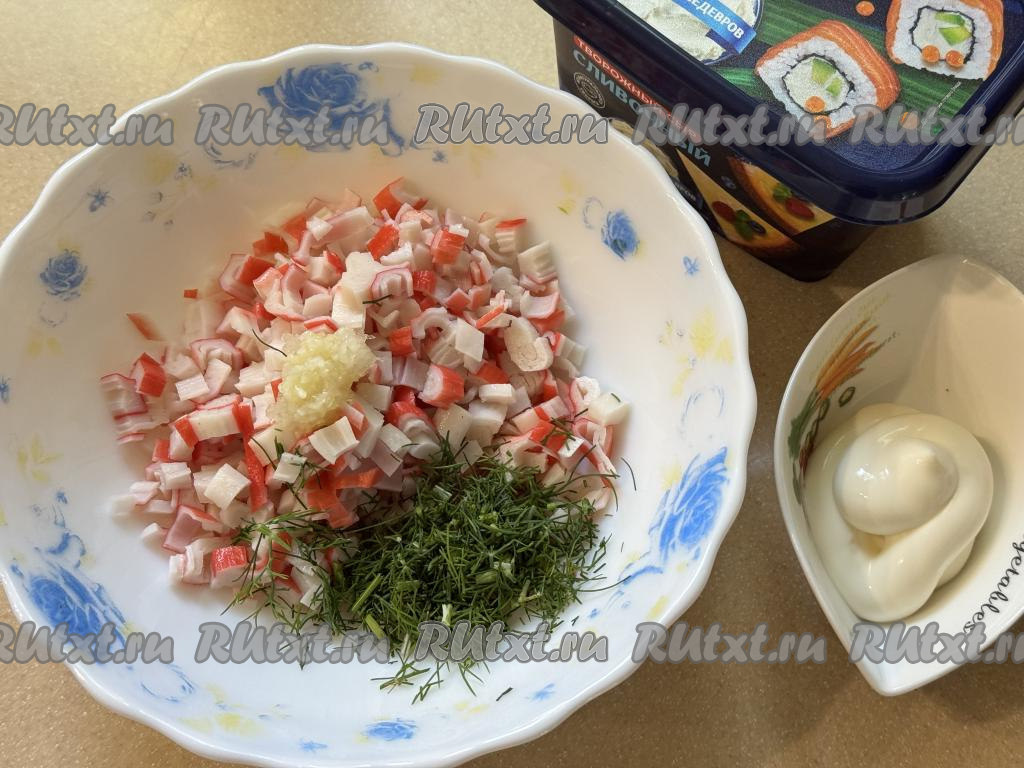 В глубокой тарелке соединить крабовые палочки, укроп и пропущенный через пресс чеснок.