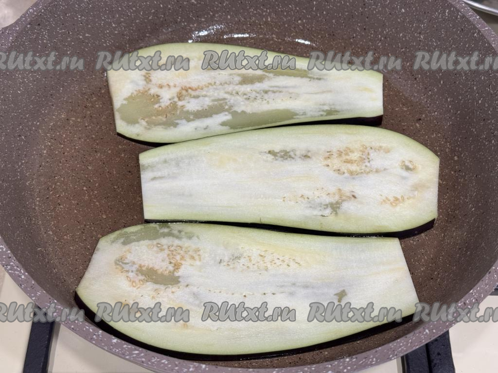 Сковороду хорошо разогреть с растительным маслом. Выложить несколько полосок баклажана в сковороду в один слой.