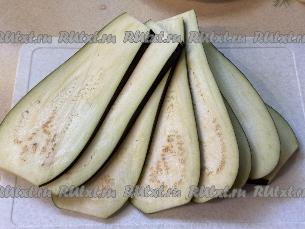 Баклажан нарезать на длинные полоски толщиной примерно 5 миллиметров (у меня получились 9 полосок).