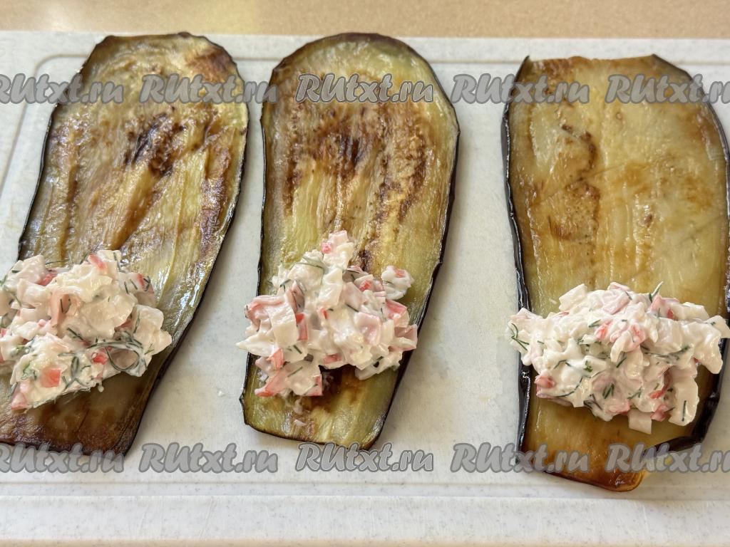 Выложить полоски баклажана на разделочную доску. Положить на более узкий край каждой полоски из баклажана по 1 чайной ложке начинки из сыра и крабовых палочек.