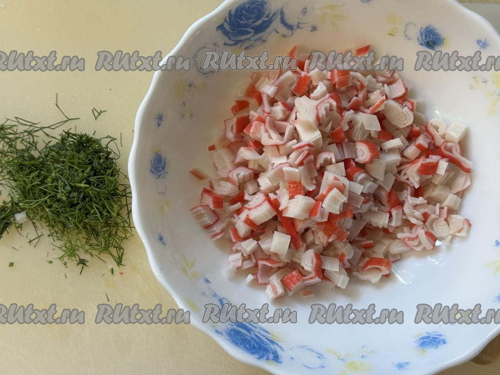 Крабовые палочки освободить от слюды и мелко нарезать. Укроп помыть, обсушить и мелко нарезать.