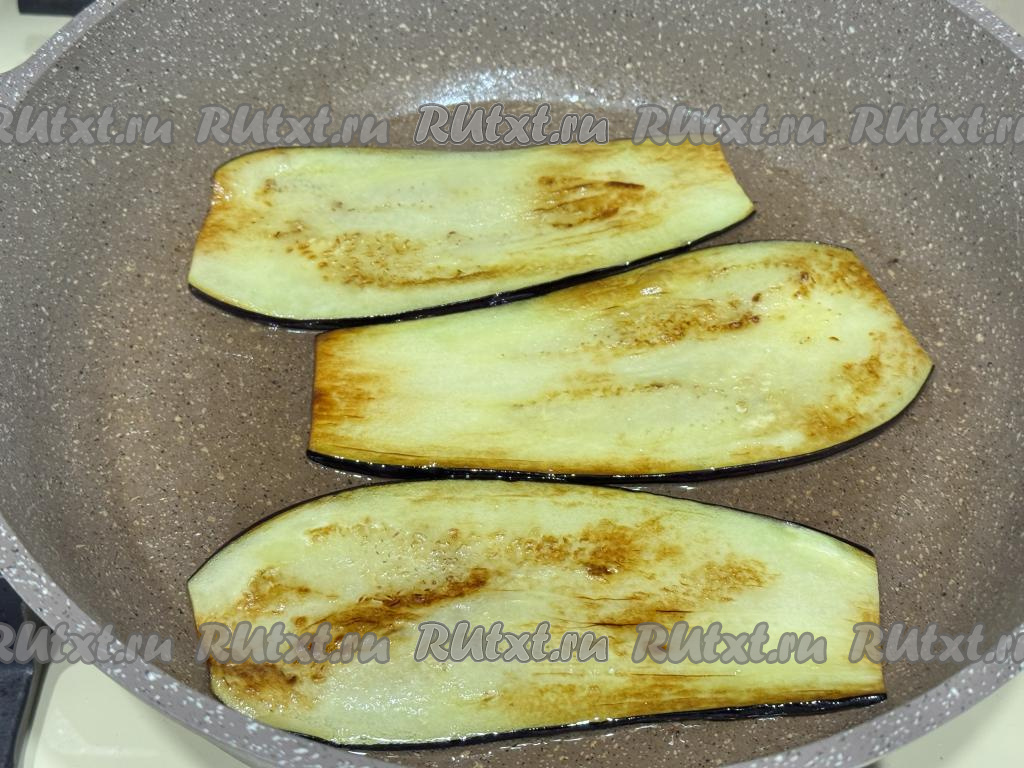 Жарить баклажаны с двух сторон до золотистого цвета на среднем огне. Баклажаны должны стать мягкими, но при этом ещё держать форму. Готовые жареные баклажаны выкладывать со сковороды на бумажные полотенца, чтобы убрать лишнее масло. Постепенно пожарить все полоски баклажана, дать остыть.