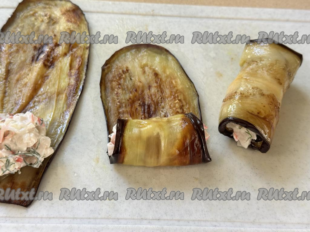 Завернуть полоску баклажана в рулетик, начиная со стороны с начинкой.