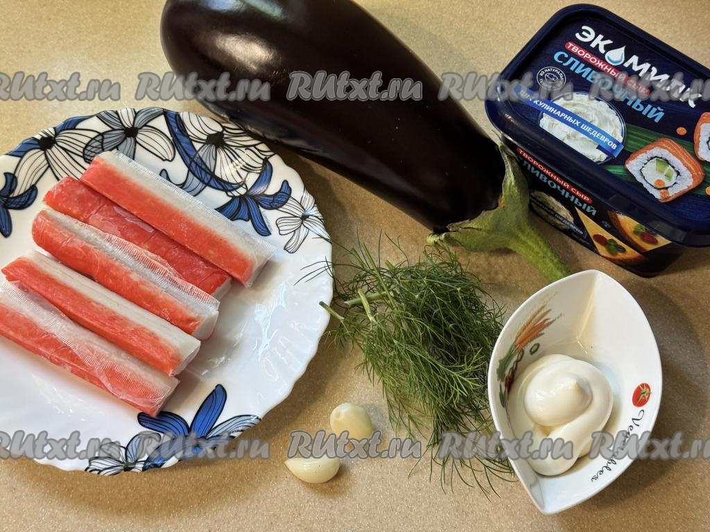 Подготовить продукты. Баклажан помыть, отрезать кончики с двух сторон. Зубчики чеснока очистить. Крабовые палочки разморозить при комнатной температуре.