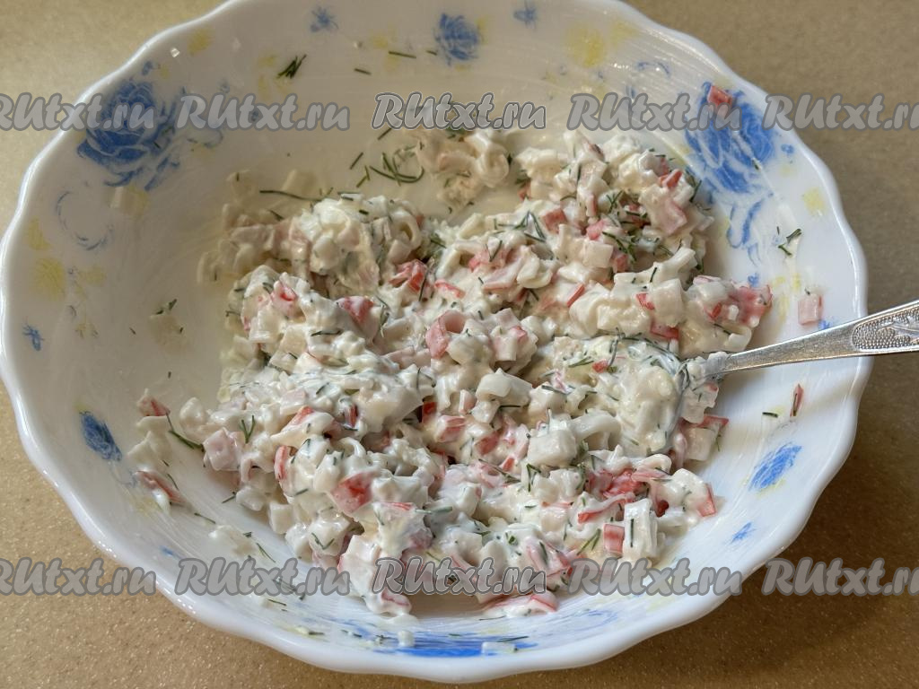 Хорошо перемешать и начинка из крабовых палочек и творожного сыра для рулетиков из баклажана готова.