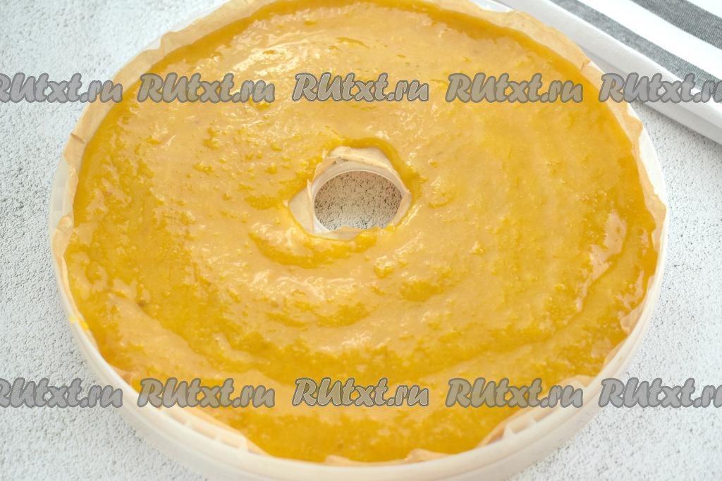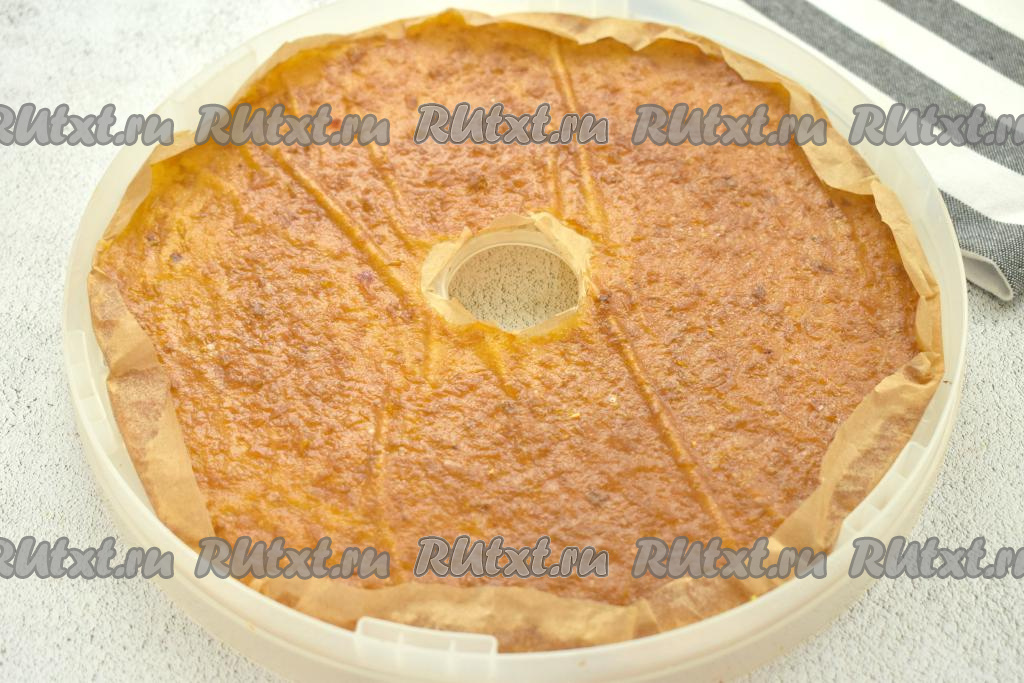 В моей сушилке нет специальных поддонов для сушки пастилы, поэтому я использовала для сушки силиконизированный пергамент, застелив обычные поддоны вырезанным под размер поддона пергаментом. Остывшую сливовую массу выкладываем на поддоны с пергаментом. Толщина слоя сливового пюре должна быть 5-7 миллиметров. Чтобы уместить всю сливовую массу мне потребовались 2 поддона диаметром 24 сантиметра.