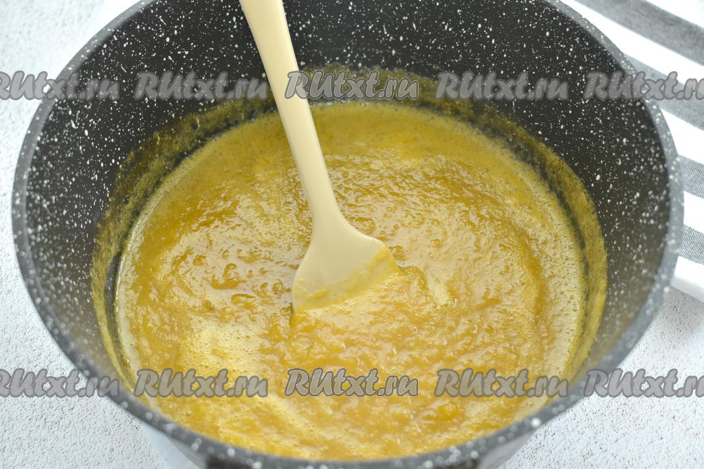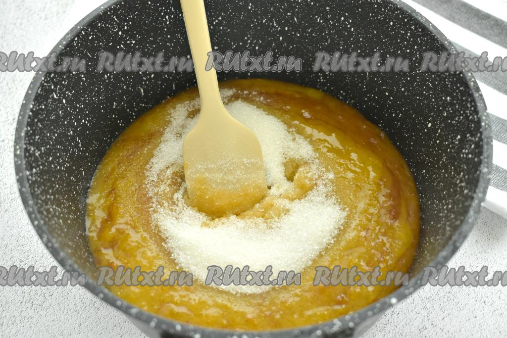 Пюре из слив оставляем на полчаса настояться. Затем перекладываем пюре из слив в кастрюлю с толстым дном, всыпаем сахар, перемешиваем.