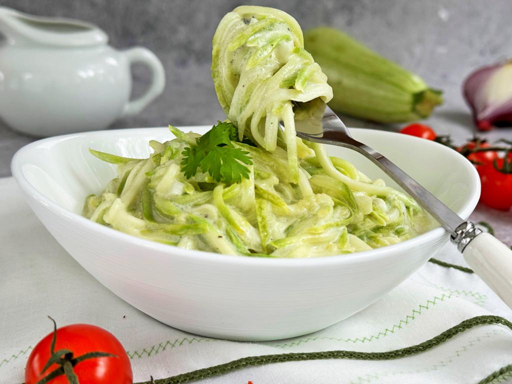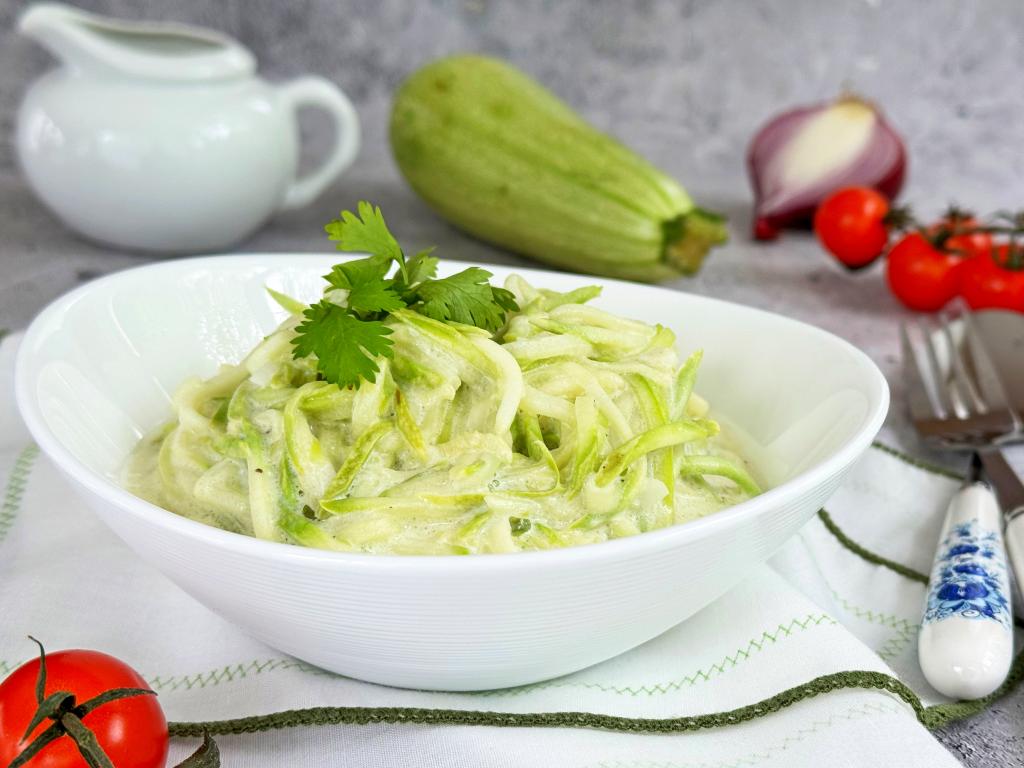 Спагетти из кабачков - это кабачки, натёртые на тёрке для моркови по-корейски (или нарезанные на очень тонкие полоски). Безусловно, никакого отношения к известным всем макаронам "Спагетти" это блюдо не имеет, однако внешнее сходство есть. Готовят спагетти из кабачков по-разному. В этот раз предлагаю потушить их в сливках за считанные минуты. Спагетти из кабачков, тушёные в сливках, получаются очень вкусными, нежными, аппетитными, отлично сохраняют форму. К столу их можно подавать и в качестве основного блюда, и в качестве гарнира к птице, мясу.
