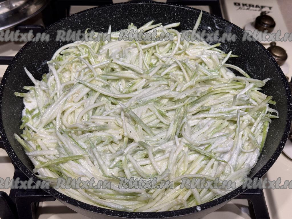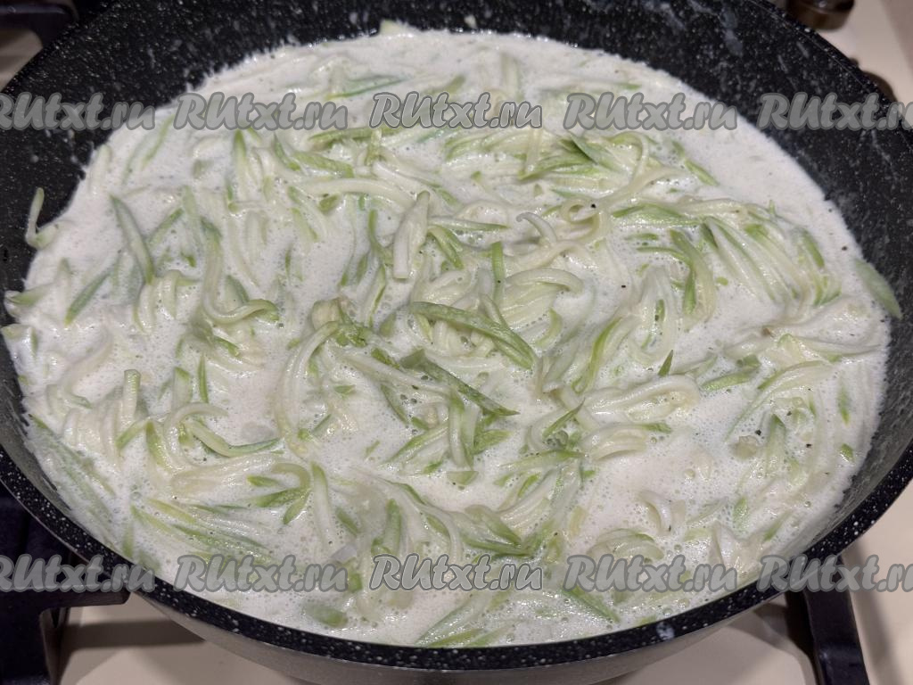 В сковороду со сливками добавить натёртые (или нарезанные) кабачки.