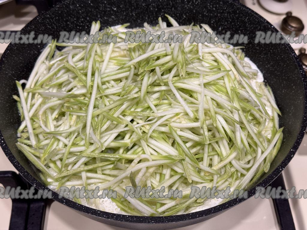 Для этого блюда нужно брать молодые кабачки с мелкими семечками и тонкой кожурой. Тонкую кожуру с молодых кабачков можно не снимать. Достаточно будет просто тщательно вымыть кабачки и обрезать кончики с двух сторон. Кабачки натереть на тёрке для корейской моркови (если нет такой тёрки, можно нарезать на тонкие длинные полоски, напоминающие спагетти).