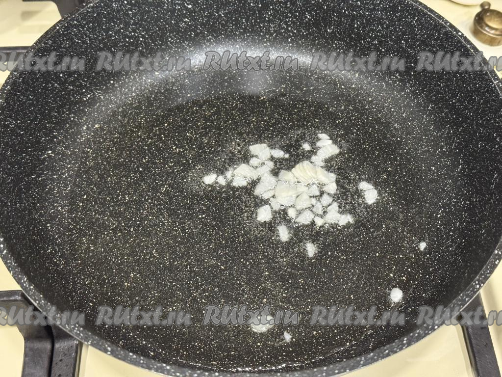 В сковороду влить растительное масло, разогреть, выложить очищенные и мелко нарезанные зубчики чеснока, обжарить на среднем огне 1 минуту, периодически перемешивая.