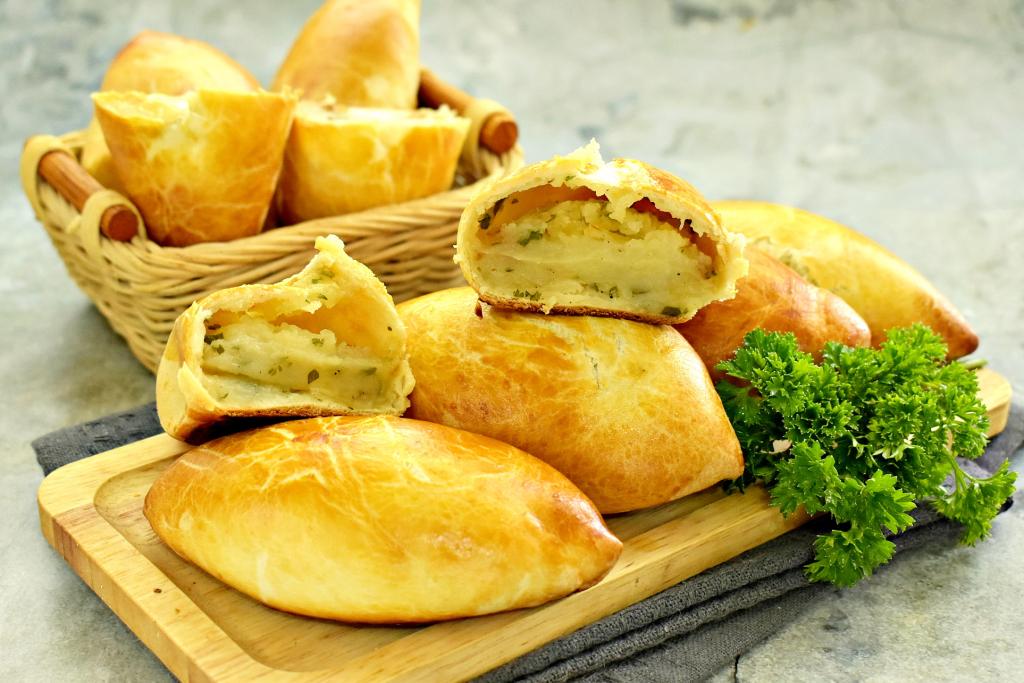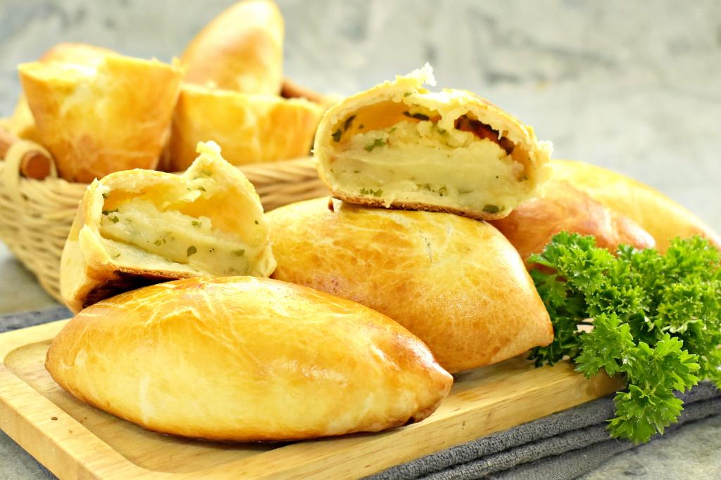 В центр каждой лепёшки выкладываем 2 столовых ложки остывшей картофельной начинки. Скрепляем края теста над начинкой, формируя пирожок. Постепенно формируем все 8 пирожков.