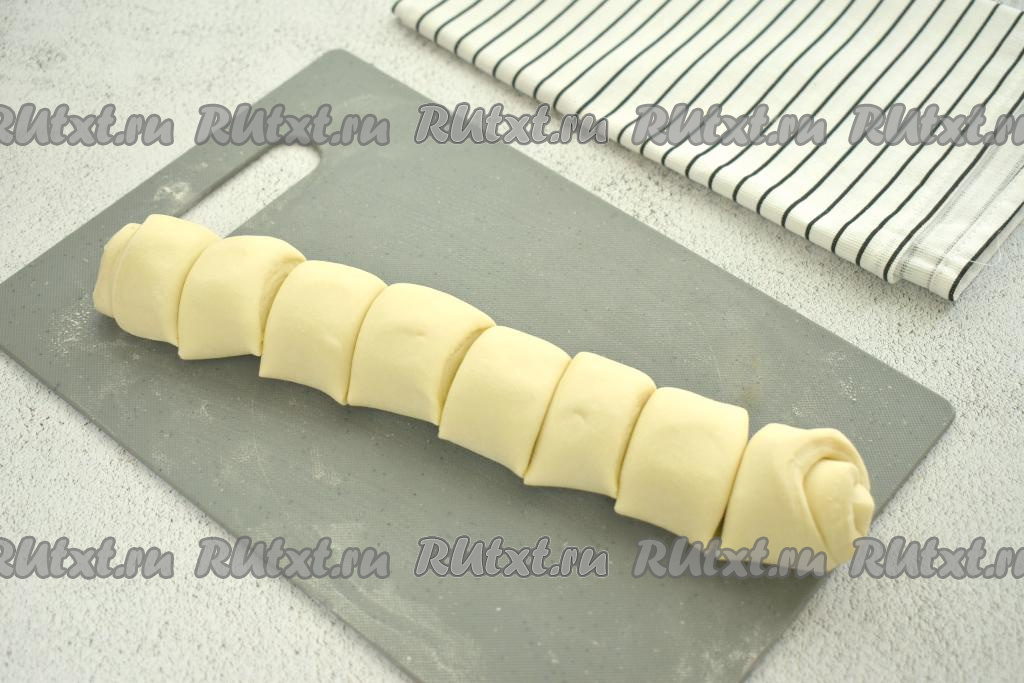 Размороженный пласт слоёного дрожжевого теста, не раскатывая, на присыпанной мукой поверхности сворачиваем в плотный рулет, нарезаем его на 8 кусочков.